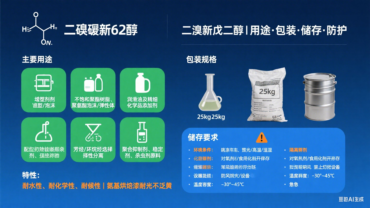 二溴新戊二醇被廣泛用作增塑劑,用于生產不飽和聚酯樹脂、無油醇酸樹脂、聚氨酯泡沫和彈性體,是良好潤滑油和其他精細化學品的添加劑。新戊二醇是一種優良的溶劑,可用于芳烴和環烷烴的選擇性分離。新戊二醇具有耐水性、耐化學性和耐候性。氨基烘焙漆具有良好的耐光性,不會變黃。它也可以用作生產聚合抑制劑、穩定劑和殺蟲劑的原料。
